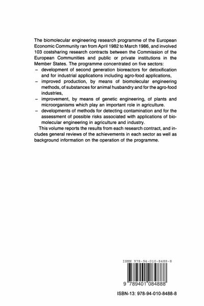 1. Implementation of BEP.- 2. Scientific and technical value.- 3. Interest for the Community.- 4. The Biotechnology Action Programme.- 5. Role of the Advisory Committees.- Summary Reviews of Scientific Achievements by Research Sectors.- 1. Sector 1 : Second generation bioreactors.- 2. Sector 2.1 : Genetic engineering of virus and cellular genes important in animal husbandry.- 3. Sectors 2.2 + 3 : Genetic engineering of microorganisms important for agro-food industries.- 4. Sector 4 : Genetic engineering of plants and micro-organisms important for agriculture.- Coordination Activities.- 1. Scientific meetings.- 2. Visits to laboratories.- 3. Publications and reports.- Final Reports from the laboratories participating in the research programme.- 1. Development of second generation bioreactors (multi-enzymatic, multiphase or requiring a co-factor) for detoxification and for industrial applications including agro-food applications..- 2. Improved production, by means of biomolecular engineering methods, of substances for: - animal husbandry (particularly vaccines and hormones), - agro-food industries..- 2.1 Animal husbandry.- 2.2 Agro-food industries..- 3. Upgrading of plant products, particularly ligno-cellulose, by means of biomolecular engineering methods..- 4. Improvement, by means of genetic engineering, of plants and microorganisms which play an important role in agriculture..- 5. Development of methods for detecting contamination and for the assessment of possible risks associated with applications of biomolecular engineering in agriculture and industry..- Indexes.- 1. Index of project leaders.- 2. Index of keywords.- 3. Index of cities.- 4. Index of contract numbers.