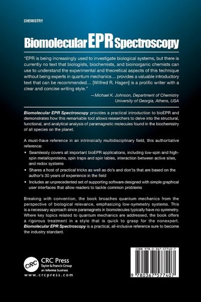 Comprehensive, Up-to-Date Coverage of Spectroscopy Theory and its Applications to Biological Systems Although a multitude of books have been published about spectroscopy, most of them only occasionally refer to biological systems and the specific problems of biomolecular EPR (bioEPR). Biomolecular EPR Spectroscopy provides a practical introduction to bioEPR and demonstrates how this remarkable tool allows researchers to delve into the structural, functional, and analytical analysis of paramagnetic molecules found in the biochemistry of all species on the planet. A Must-Have Reference in an Intrinsically Multidisciplinary Field This authoritative reference seamlessly covers all important bioEPR applications, including low-spin and high-spin metalloproteins, spin traps and spin lables, interaction between active sites, and redox systems. It is loaded with practical tricks as well as do's and don'ts that are based on the author's 30 years of experience in the field. The book also comes with an unprecedented set of supporting software designed with simple graphical user interfaces that allow readers to tackle problems they will likely encounter when engaged in spectral analysis. Breaking with convention, the book broaches quantum mechanics from the perspective of biological relevance, emphasizing low-symmetry systems. This is a necessary approach since paramagnets in biomolecules typically have no symmetry. Where key topics related to quantum mechanics are addressed, the book offers a rigorous treatment in a style that is quick-to-grasp for the non expert. Biomolecular EPR Spectroscopy is a practical, all-inclusive reference sure to become the industry standard.