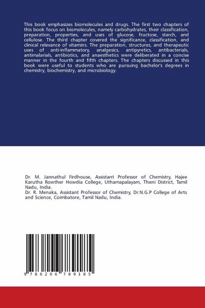 This book emphasizes biomolecules and drugs. The first two chapters of this book focus on biomolecules, namely carbohydrates, their classification, preparation, properties, and uses of glucose, fructose, starch, and cellulose. The third chapter covered the significance, classification, and clinical relevance of vitamins. The preparation, structures, and therapeutic uses of anti-inflammatory, analgesics, antipyretics, antibacterials, antimalarials, antibiotics, and anaesthetics were deliberated in a concise manner in the fourth and fifth chapters. The chapters discussed in this book were useful to students who are pursuing bachelor's degrees in chemistry, biochemistry, and microbiology.