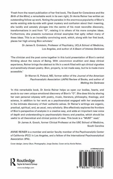Dr Annie Reiner's new book, Bion and Being: Passion and the Creative Mind, examines the similarities between this psychoanalytic space and the artist's creative sensibility, as well as mystical and religious states. This most mysterious and revolutionary of Bion's analytic ideas reflects what is essentially a state of being.