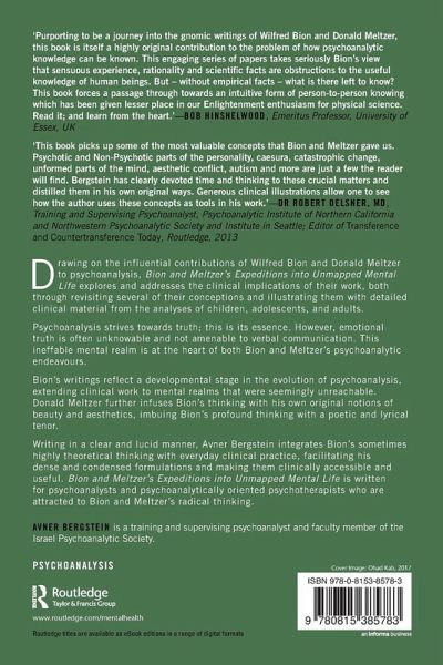 Writing in a clear and lucid manner, Avner Bergstein integrates Bion's sometimes highly theoretical thinking with everyday clinical practice, facilitating his dense and condensed formulations and making them clinically accessible and useful. Bion and Meltzer's Expeditions into Unmapped Mental Life is written for psychoanalysts and psychoanalytically oriented psychotherapists who are attracted to Bion and Meltzer's radical thinking.