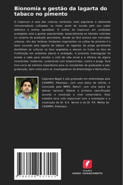 O Capsicum é uma das culturas hortícolas mais populares e altamente remuneradoras cultivadas na maior parte do mundo pelo seu sabor delicioso e aroma agradável. O cultivo de Capsicum em condições protegidas está a ganhar popularidade, especialmente os híbridos coloridos no sistema de produção periurbano, devido ao fácil acesso aos mercados urbanos. Um dos factores limitantes importantes no cultivo do pimento é o dano causado pela lagarta do tabaco. As lagartas da praga geralmente desfolham as culturas na fase vegetativa e atacam os frutos na fase de frutificação em ambiente aberto e protegido. A presente investigação foi levada a cabo para estudar o ciclo de vida anual e a eficácia de alguns insecticidas modernos, juntamente com biopesticidas, contra a praga. Este livro seria de extrema importância para os estudantes de graduação e pós-graduação, bem como para os investigadores de Entomologia e Horticultura.