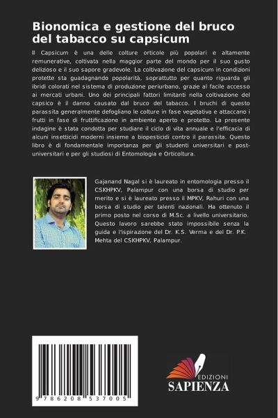 Il Capsicum è una delle colture orticole più popolari e altamente remunerative, coltivata nella maggior parte del mondo per il suo gusto delizioso e il suo sapore gradevole. La coltivazione del capsicum in condizioni protette sta guadagnando popolarità, soprattutto per quanto riguarda gli ibridi colorati nel sistema di produzione periurbano, grazie al facile accesso ai mercati urbani. Uno dei principali fattori limitanti nella coltivazione del capsico è il danno causato dal bruco del tabacco. I bruchi di questo parassita generalmente defogliano le colture in fase vegetativa e attaccano i frutti in fase di fruttificazione in ambiente aperto e protetto. La presente indagine è stata condotta per studiare il ciclo di vita annuale e l'efficacia di alcuni insetticidi moderni insieme a biopesticidi contro il parassita. Questo libro è di fondamentale importanza per gli studenti universitari e post-universitari e per gli studiosi di Entomologia e Orticoltura.
