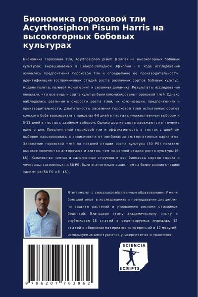 Bionomika gorohowoj tli, Acyrthosiphon pisum (Harris) na wysokogornyh bobowyh kul'turah, wyraschiwaemyh w Sewero-Zapadnoj Jefiopii - V hode issledowaniq izuchalis' predpochteniq gorohowoj tli i opredelenie ee proizwoditel'nosti, identifikaciq wospriimchiwyh stadij rosta razlichnyh sortow bobowyh kul'tur, modeli poleta, polewoj monitoring i sezonnaq dinamika. Rezul'taty issledowaniq pokazali, chto wse widy i sorta kul'tur byli kolonizirowany gorohowoj tlej. Odnako nablüdalis' razlichiq w skorosti rosta tlej, ih kolonizacii, predpochteniqh i proizwoditel'nosti. Dlitel'nost' zaseleniq gorohowoj tlej ispytuemyh sortow konskogo boba war'irowala w predelah 4-6 dnej w testah s mnozhestwennym wyborom i 5-11 dnej w testah s dwojnym wyborom. Odnako drugie sorta zarazhaütsq w techenie odnogo dnq. Predpochtenie gorohowoj tli i äffektiwnost' w testah s dwojnym wyborom war'irowalis' w zawisimosti ot kombinacii al'ternatiwnyh wariantow. Zarazhenie gorohowoj tlej na pozdnej stadii rosta kul'tury (50 PS) pokazalo wysokoe kolichestwo apterousow i alatow, chem na rannej stadii rosta kul'tury (6-LS). Kolichestwo polnyh i zapolnennyh struchkow i wes biomassy sortow goroha i chechewicy, zaselennyh na 50 PS, byli znachitel'no wyshe, chem na bolee rannih stadiqh zaseleniq (50 FS i 6 - LS).