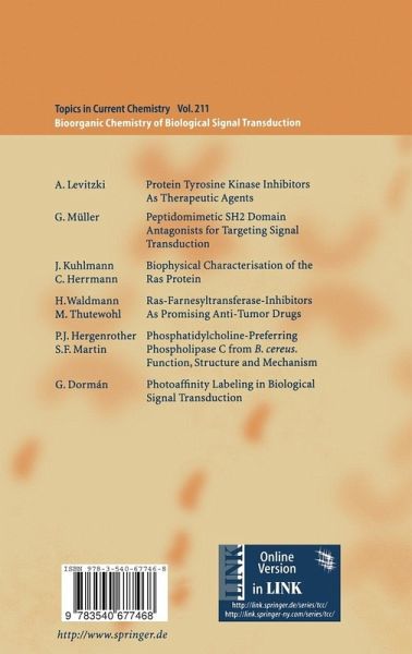 The transduction of signals from the extracellular space across the plasma membrane into the interior of cells and ultimately to the nucleus, where in - sponse to such external signals the transcription of the genetic code is inf- enced,belongs to the most fundamental and important events in the regulation of the life cycle of cells. During recent years several signal transduction cascades have been elucidated which regulate,for instance,the growth and the prolife- tion of organisms as diverse as mammals, flies, worms and yeast. The general picture which emerged from these investigations is that nature employs a c- bination of non-covalent ligand/protein and protein/protein interactions together with a set of covalent protein modifications to generate the signals and transduce them to their destinations. The ligands which are recognized may be low molecular weight compounds like lipids, inositol derivatives, steroids or microbial products like cyclosporin. They may be proteins like, for instance, growth factors or intracellular adaptor proteins which carry SH2 or SH3 domains, and they may be specific DNA stretches which are selectively rec- nized by transcription factors. These and other aspects of biological signal transduction provide an open and rewarding field for investigations by scientists from various different dis- plines of biology,medical research and chemistry working in academic research institutions or in industry.