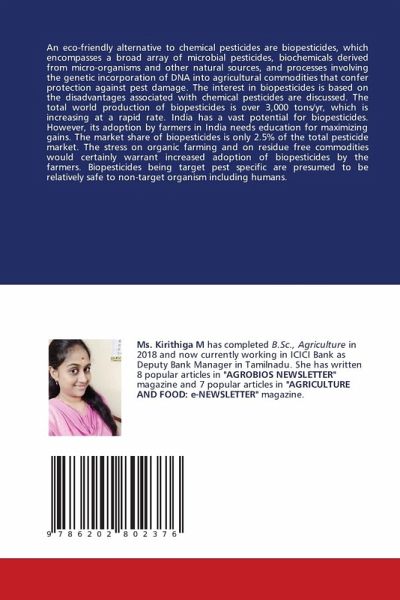 An eco-friendly alternative to chemical pesticides are biopesticides, which encompasses a broad array of microbial pesticides, biochemicals derived from micro-organisms and other natural sources, and processes involving the genetic incorporation of DNA into agricultural commodities that confer protection against pest damage. The interest in biopesticides is based on the disadvantages associated with chemical pesticides are discussed. The total world production of biopesticides is over 3,000 tons/yr, which is increasing at a rapid rate. India has a vast potential for biopesticides. However, its adoption by farmers in India needs education for maximizing gains. The market share of biopesticides is only 2.5% of the total pesticide market. The stress on organic farming and on residue free commodities would certainly warrant increased adoption of biopesticides by the farmers. Biopesticides being target pest specific are presumed to be relatively safe to non-target organism including humans.