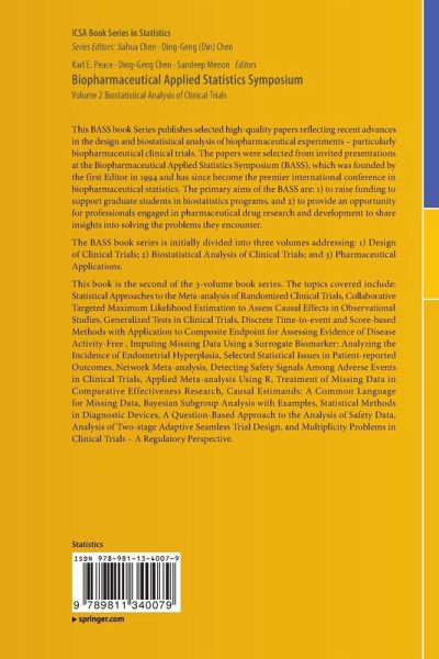 The BASS book series is initially divided into three volumes addressing: 1) Design of Clinical Trials; 2) Biostatistical Analysis of Clinical Trials; and 3) Pharmaceutical Applications.
