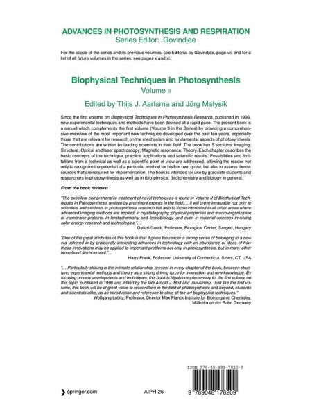 "'Biophysical Techniques in Photosynthesis II' ... brings about new developments in the biophysical tools and techniques, and how they could reveal the finer and deeper details of the mechanism of photosynthesis. ... All the contributors have done excellent job. ... strongly recommends that departments, colleges, universities and institutes (traditional and professionals) should have copies of this valuable book on biophysical techniques." (Prasanna Mohanty, Indian Journal of Biochemistry and Biophysics, Vol. 45, October, 2008)