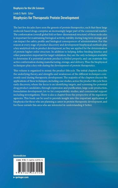 This book can be used to provide insight into this important application of biophysics for those who are planning a career in protein therapeutic development, and for those outside this area who are interested in understanding it better. The initial chapters describe the underlying theory, and strengths and weaknesses of the different techniques commonly used during therapeutic development. The majority of the chapters discuss the applications of these techniques, including case studies, across the product lifecycle from early discovery, where the focus is on identifying targets, and screening for potential drug product candidates, through expression and purification, large scale production, formulation development, lot-to-lot comparability studies, and commercial support including investigations.