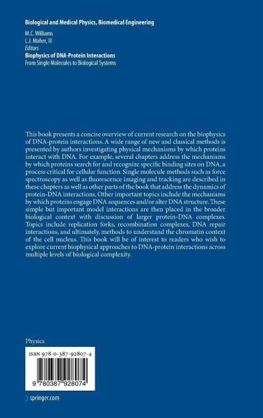 Depite the rapid expansion of the field of biophysics, there are very few books that comprehensively treat specific topics in this area. Recently, the field of single molecule biophysics has developed very quickly, and a few books specifically treating single molecule methods are beginning to appear. However, the promise of single molecule biophysics is to contribute to the understanding of specific fields of biology using new methods. This book would focus on the specific topic of the biophysics of DNA-protein interactions, and would include the use of new approaches, including both bulk methods as well as single molecule methods. This would make the book attractive to anyone working in the general area of DNA-protein interactions, which is of course a much wider market than just single molecule biophysicists or even biophysicists.