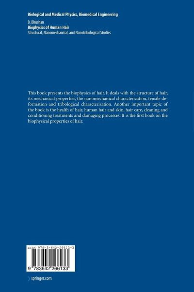 This book presents the biophysics of hair. It deals with the structure of hair, its mechanical properties, the nanomechanical characterization, tensile deformation, tribological characterization, the thickness distribution and binding interactions on hair surface. Another important topic of the book is the health of hair, human hair and skin, hair care, cleaning and conditioning treatments and damaging processes. It is the first book on the biophysical properties of hair.