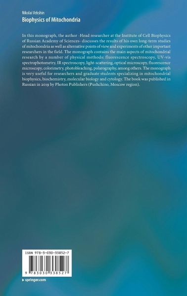 In this monograph, the author -Head researcher at the Institute of Cell Biophysics of Russian Academy of Sciences- discusses the results of his own long-term studies of mitochondria as well as alternative points of view and experiments of other important researchers in the field. The monograph contains the main aspects of mitochondrial research by a number of physical methods: fluorescence spectroscopy, UV-vis spectrophotometry, IR spectroscopy, light-scattering, optical microscopy, fluorescence microscopy, colorimetry, photobleaching, polarography, among others. The monograph is very useful for researchers and graduate students specializing in mitochondrial biophysics, biochemistry, molecular biology and cytology. The book was published in Russian in 2019 by Photon Publishers (Pushchino, Moscow region).