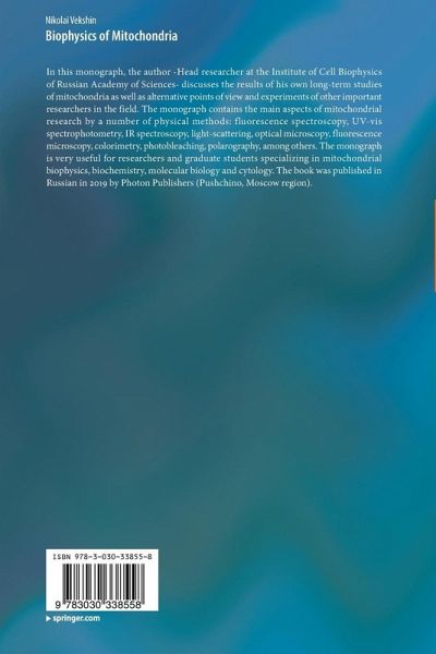 In this monograph, the author -Head researcher at the Institute of Cell Biophysics of Russian Academy of Sciences- discusses the results of his own long-term studies of mitochondria as well as alternative points of view and experiments of other important researchers in the field. The monograph contains the main aspects of mitochondrial research by a number of physical methods: fluorescence spectroscopy, UV-vis spectrophotometry, IR spectroscopy, light-scattering, optical microscopy, fluorescence microscopy, colorimetry, photobleaching, polarography, among others. The monograph is very useful for researchers and graduate students specializing in mitochondrial biophysics, biochemistry, molecular biology and cytology. The book was published in Russian in 2019 by Photon Publishers (Pushchino, Moscow region).