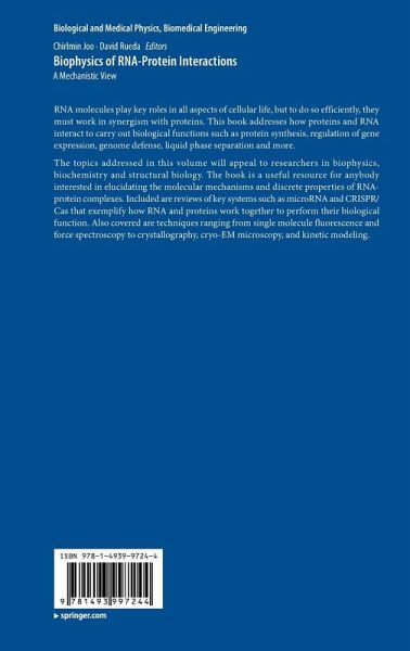 The topics addressed in this volume will appeal to researchers in biophysics, biochemistry and structural biology. The book is a useful resource for anybody interested in elucidating the molecular mechanisms and discrete properties of RNA-protein complexes. Included are reviews of key systems such as microRNA and CRISPR/Cas that exemplify how RNA and proteins work together to perform their biological function. Also covered are techniques ranging from single molecule fluorescence and force spectroscopy to crystallography, cryo-EM microscopy, and kinetic modeling.