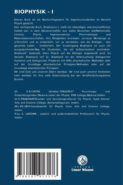 Dieses Buch ist als Nachschlagewerk für Ingenieurstudenten im Bereich Physik gedacht.Das vorliegende Buch, Biophysics-I, stellt ein lebendiges wissenschaftliches Gebiet dar, in dem Wissenschaftler aus vielen Bereichen wieMathematik, Chemie, Physik, Ingenieurwesen, Pharmakologie und Materialwissenschaften, ihre Fähigkeiten einsetzen, umneue Werkzeuge zu erforschen und zu entwickeln, um zu verstehen, wie die Biologie - das gesamte Leben - funktioniert. Der Studiengang Biophysik ist auch ein ausgezeichneterWeg für Studenten, die ein Aufbaustudium anstreben. Biophysik" bedeutet, dass Physik auf die Biologie angewandt wird: Ist daswas Biophysik ist? Ja, Biophysik ist die Untersuchung biologischer Systeme und biologischer Prozesse mit Hilfe physikalischer Methoden oder auf der Grundlage physikalischer Prinzipien.Methoden oder auf der Grundlage physikalischer Prinzipien.Wir sind Gott und unseren Eltern dankbar. Wir sind auch unserer Institution sehr dankbar für ihre volle Unterstützung bei der Veröffentlichungdieses Buches.