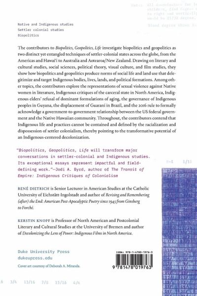 The contributors to Biopolitics, Geopolitics, Life investigate biopolitics and geopolitics as two distinct yet entangled techniques of settler-colonial states across the globe, from the Americas and Hawai'i to Australia and Aotearoa/New Zealand. Drawing on literary and cultural studies, social sciences, political theory, visual culture, and film studies, they show how biopolitics and geopolitics produce norms of social life and land use that delegitimize and target Indigenous bodies, lives, lands, and political formations. Among other topics, the contributors explore the representations of sexual violence against Native women in literature, Indigenous critiques of the carceral state in North America, Indigenous elders' refusal of dominant formulations of aging, the governance of Indigenous peoples in Guyana, the displacement of Guaraní in Brazil, and the 2016 rule to formally acknowledge a government-to-government relationship between the US federal government and the Native Hawaiian community. Throughout, the contributors contend that Indigenous life and practices cannot be contained and defined by the racialization and dispossession of settler colonialism, thereby pointing to the transformative potential of an Indigenous-centered decolonization. Contributors René Dietrich, Jacqueline Fear-Segal, Mishuana Goeman, Alyosha Goldstein, Sandy Grande, Michael R. Griffiths, Shona N. Jackson, Kerstin Knopf, Sabine N. Meyer, Robert Nichols, Mark Rifkin, David Uahikeaikalei¿ohu Maile