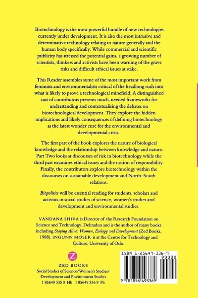 Foreword Preface List of Contributors 1. Introduction: Mobilizing Critical Communities and Discourses on Modern Biotechnology - Ingunn Moser Part I: Biotechnology as Culture: (Re)constructions of Biology and Nature 2. Human Nature - Ruth Hubbard 3. Genes as Causes - Ruth Hubbard 4. Fractured Images of Science, Language and Power: A Post-Modern Optic, or Just Bad Eyesight? - Evelyn Fox Keller 5. Otherworldly Conversations, Terrain Topics, Local Terms - Donna Haraway Part II: Biohazards: Risk in Context 6. The Limits of Experimental Knowledge: A Feminist Perspective on the Ecological Risks of Genetic Engineering - Regine Kollek 7. Error-Friendliness and the Evolutionary Impact of Deliberate Release of GMOs - Christine von Weizsacker 8. The Greening of Biotechnology: GMOs as Environment-Friendly Products - Les Levidow and Joyce Tait Part III: Bioethics, Knowledge, and Ethics as Politics 9. Biosemiotics and Ethics - Jesper Hoffmeyer 10. A 'Genethics' that Makes Sense - Rosalyn Diprose 11. Whose Ethics for Agricultural Biotechnology? - Les Levidow Part IV: Biopolitics: The Political Ecology of Biotechnology 12. Biotechnological Development and the Conservation of Biodiversity - Vandana Shiva 13. Biotechnology, Patents and the Third World - Cary Fowler 14. Biotechnology and the Future of Agriculture - Nicanor Perlas 16. Epilogue: Beyond Redcutionism - Vandana Shiva Glossary A Select Guide to Further Reading Index