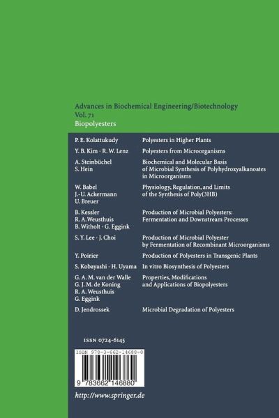 Living systems synthesize seven different classes of polymers. They provide structure and form for cells and organisms, function as catalysts and energy storage and carry the genetic information. All these polymers possess technically interesting properties. Some of these biopolymers are already used commercially. This special volume of Advances in Biochemical Engineering/Biotechnology comprises 10 chapters. It gives an overview of the water insoluble biopolyesters, in particular of the microbially synthesized poly-hydroxyalkanoate (PHA) family. It reports the state of the art of metabolism, regulation and genetic background, the latest advances made in genetic optimization of bacteria, "construction" of transgenic plants and in vitro synthesis by means of purified enzymes. Furthermore, it describes relevant technologies and evaluates perspectives concerning increasing the economic viability and competitiveness of PHA and discusses applications in medicine, packaging, food and other fields.