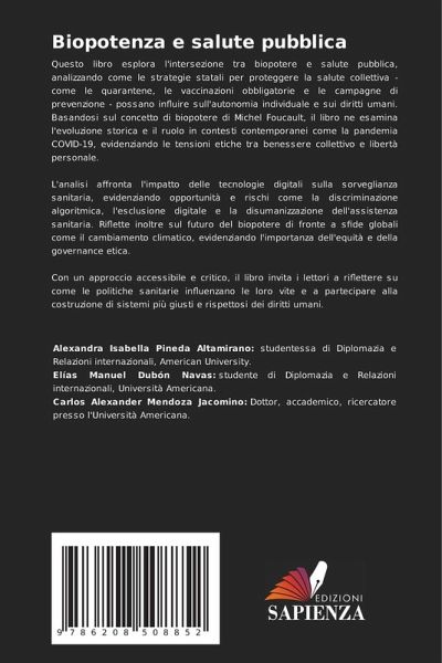 Questo libro esplora l'intersezione tra biopotere e salute pubblica, analizzando come le strategie statali per proteggere la salute collettiva - come le quarantene, le vaccinazioni obbligatorie e le campagne di prevenzione - possano influire sull'autonomia individuale e sui diritti umani. Basandosi sul concetto di biopotere di Michel Foucault, il libro ne esamina l'evoluzione storica e il ruolo in contesti contemporanei come la pandemia COVID-19, evidenziando le tensioni etiche tra benessere collettivo e libertà personale.L'analisi affronta l'impatto delle tecnologie digitali sulla sorveglianza sanitaria, evidenziando opportunità e rischi come la discriminazione algoritmica, l'esclusione digitale e la disumanizzazione dell'assistenza sanitaria. Riflette inoltre sul futuro del biopotere di fronte a sfide globali come il cambiamento climatico, evidenziando l'importanza dell'equità e della governance etica.Con un approccio accessibile e critico, il libro invita i lettori a riflettere su come le politiche sanitarie influenzano le loro vite e a partecipare alla costruzione di sistemi più giusti e rispettosi dei diritti umani.
