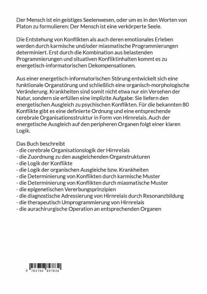 Der Mensch ist ein geistiges Seelenwesen, oder um es in den Worten von Platon zu formulieren: Der Mensch ist eine verkörperte Seele. Die Entstehung von Konflikten als auch deren emotionales Erleben werden durch karmische und/oder miasmatische Muster determiniert. Erst durch die Kombination aus diesen Belastungen und aus situativen Konfliktinhalten kommt es zu energetisch-informatorischen Dekompensationen. Aus einer energetisch-informatorischen Störung entwickelt sich eine funktionelle Störung und schließlich eine organisch-morphologische Veränderung. Krankheiten sind somit nicht ein Versehen der Natur, sondern sie erfüllen eine implizite Aufgabe: Sie liefern den energetischen Ausgleich. Für die bekannten 80 Konflikte gibt es eine definierte Ordnung und eine entsprechende cerebrale Organisationsstruktur in Form von Hirnrelais. Auch der energetische Ausgleich auf den peripheren Organen folgt einer klaren Logik.Das Buch erläutert die Möglichkeiten der biologischen Programmierung vonHirnrelais zur Löschung der Konflikte und zur Therapie funktioneller und organischer Störungen.