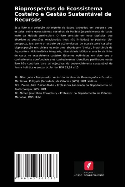 Este livro é a colecção abrangente de dados baseados em pesquisa dos estudos sobre ecossistemas costeiros da Malásia (especialmente da costa leste da Malásia peninsular). O livro consiste em nove capítulos que abordam as questões relacionadas (mas não limitadas) ao potencial bio-prospecto, tais como o rastreio de actinomicetos do ecossistema costeiro, bioprospecção microbiana usando uma abordagem 'ómica', importância da Aquacultura Multi-troférica integrada, diversidade biótica e erosão da linha de costa no ecossistema costeiro. Estamos optimistas em dizer que o conhecimento aprofundado e os conhecimentos científicos partilhados neste livro irão contribuir para os objectivos de desenvolvimento sustentável de forma holística e em particular no SDG 13,14 e 15.
