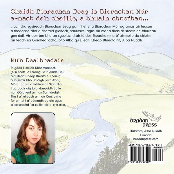 Chaidh Biorachan Beag is Biorachan Mór a-mach do'n choille, a bhuain chnothan...ach cha sguireadh Biorachan Beag gan ithe! Bha Biorachan Mór ag amas air leasan a theagasg dha a charaid gionach, sanntach, agus sin mar a thòisich sreath de bhuilean gun dùil. Air aon àm bha an sgeulachd air tè den fheadhainn a b' ainmeile do chloinn air feadh na Gàidhealtachd, bho Alba gu Eilean Cheap Bhreatainn, Alba Nuadh. This is the Nova Scotia Gaelic orthography edition. A separate Gaelic Orthographic Conventions (GOC) edition is also available. Big Biorachan and Little Biorachan went out to pick nuts... but Little Biorachan wouldn't stop eating them! Big Biorachan set out to teach his greedy friend a lesson, unleashing a chain of unintended consequences. This traditional Scottish Gaelic tale was once the most widely-known children's story in the Gaelic world. The Gaels brought the tale with them from the Highlands of Scotland to Nova Scotia and passed it down in oral traditon. Illustrator Emily MacDonald's charming illustrations accompany the traditional text, reimagining the tale in 19th-century Cape Breton. Text in Scottish Gaelic.