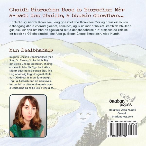 Chaidh Biorachan Beag is Biorachan Mór a-mach do'n choille, a bhuain chnothan...ach cha sguireadh Biorachan Beag gan ithe! Bha Biorachan Mór ag amas air leasan a theagasg dha a charaid gionach, sanntach, agus sin mar a thòisich sreath de bhuilean gun dùil. Air aon àm bha an sgeulachd air tè den fheadhainn a b' ainmeile do chloinn air feadh na Gàidhealtachd, bho Alba gu Eilean Cheap Bhreatainn, Alba Nuadh. This is the Gaelic Orthographic Conventions (GOC) edition. A separate Nova Scotia Gaelic orthography edition is also available. Big Biorachan and Little Biorachan went out to pick nuts... but Little Biorachan wouldn't stop eating them! Big Biorachan set out to teach his greedy friend a lesson, unleashing a chain of unintended consequences. This traditional Scottish Gaelic tale was once the most widely-known children's story in the Gaelic world. The Gaels brought the tale with them from the Highlands of Scotland to Nova Scotia and passed it down in oral traditon. Illustrator Emily MacDonald's charming illustrations accompany the traditional text, reimagining the tale in 19th-century Cape Breton. Text in Scottish Gaelic.