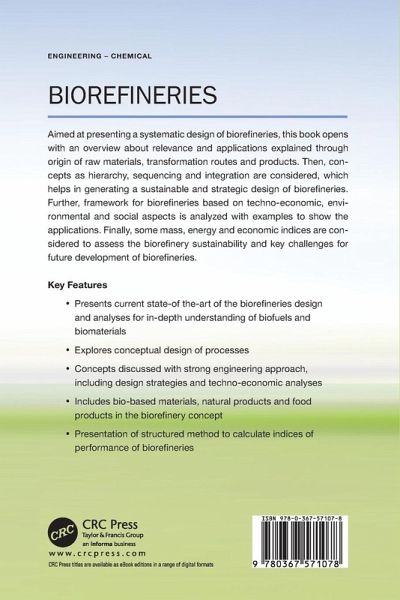 "Biorefineries: Design and Analysis presents current state-of the-art of the biorefineries design and analyses for in depth understanding of biofuels and biomaterials; explores conceptual design of processes; presents concepts discussed with strong engineering approach, including design strategies and techno-economic analyses; includes bio-based materials, natural products and food products in the biorefinery concept; and presents a structured method to calculate indices of performance of biorefineries.