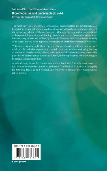 This volume focuses explicitly on the remediation of noxious substances in stressed environs. It includes expert-contributed chapters on bio-monitoring by way of evaluating the relationship of biota with the polluted/stressed environs, sustainable plant-based degradation of noxious pollutants, and the application of biotechnologies to achieve tailored responses.