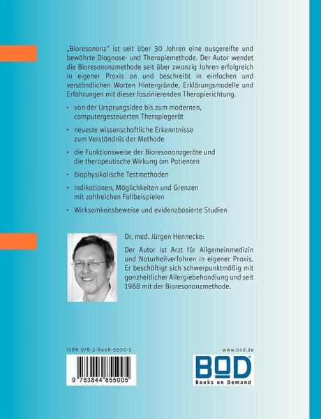 "Bioresonanz" ist seit über 30 Jahren eine ausgereifte und bewährte Diagnose- und Therapiemethode. Der Autor wendet die Bioresonanzmethode seit über zwanzig Jahren erfolgreich in eigener Praxis an und beschreibt in einfachen und verständlichen Worten Hintergründe, Erklärungsmodelle und Erfahrungen mit dieser faszinierenden Therapierichtung. - von der Ursprungsidee bis zum modernen, computergesteuerten Therapiegerät - neueste wissenschaftliche Erkenntnisse zum Verständnis der Methode - die Funktionsweise der Bioresonanzgeräte und die therapeutische Wirkung am Patienten- biophysikalische Testmethoden- Indikationen, Möglichkeiten und Grenzen mit zahlreichen Fallbeispielen- Wirksamkeitsbeweise und evidenzbasierte Studien