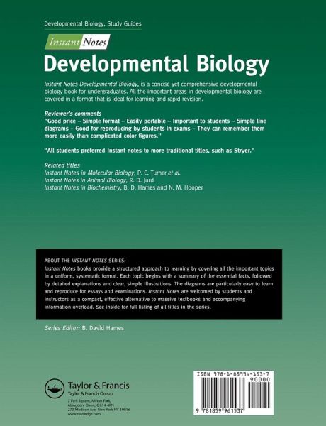 Coverage of the field in Instant Notes in Developmental Biology is current and focuses largely on the principles of embryonic development. It is designed to provide a clear summary of the principles of developmental biology in a compact and easily manageable structure.