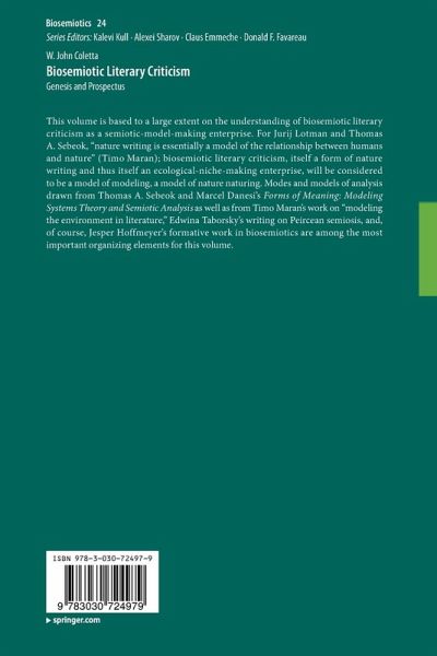 Chapter 1: Introduction: The Genesis of Biosemiotic Literary Criticism: How the Future "Presents" the Past.- Chapter 2. Modeling Environments in Literature and Literary Criticism.- Chapter 3. Evolutionary Approaches to Biosemiotic Literary Criticism.- Chapter 4. Communicative Approaches to Biosemiotic Literary Criticism.- Chapter 5. Hierarchical Approaches to Biosemiotic Literary Criticism.- Chapter 6. Significational Approaches to Biosemiotic Literary Criticism.- Chapter 7. Analogical Approaches to Biosemiotic Literary Criticism.- Chapter 8. Epilogue: The Poet as Scientist.