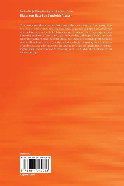 Introduction.- Colorimetric Sandwich Assays for Protein Detection.- Fluorescence Sandwich Assays for Protein Detection.- Electrochemical Sandwich Assays for Protein Detection.- Sandwich Assays Based on SPR, SERS, GMR, QCM, Microcantilever, SAW, and RRS Techniques for Protein Detection.- Colorimetric Sandwich Assays for Nucleic Acid Detection.- Fluorescence Sandwich Assays for Nucleic Acid Detection.- Electrochemical Sandwich Assays for Nucleic Acid Detection.- Sandwich Assays Based on QCM, SPR, Microcantilever, and SERS Techniques for Nucleic Acid Detection.- Sandwich Assays for Small Molecule and Ion Detection.- Sandwich Assay for Pathogen and Cells Detection.- Biosensors Based on Supersandwich Assays.