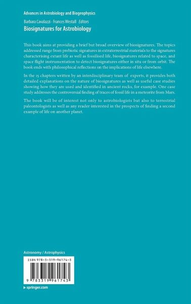 This book aims at providing a brief but broad overview of biosignatures. The topics addressed range from prebiotic signatures in extraterrestrial materials to the signatures characterising extant life as well as fossilised life, biosignatures related to space, and space flight instrumentation to detect biosignatures either in situ or from orbit. The book ends with philosophical reflections on the implications of life elsewhere. In the 15 chapters written by an interdisciplinary team of experts, it provides both detailed explanations on the nature of biosignatures as well as useful case studies showing how they are used and identified in ancient rocks, for example. One case study addresses the controversial finding of traces of fossil life in a meteorite from Mars. The book will be of interest not only to astrobiologists but also to terrestrial paleontologists as well as any reader interested in the prospects of finding a second example of life on anotherplanet.