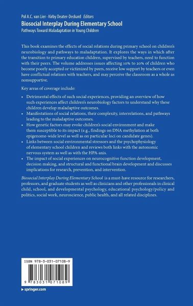 Detrimental effects of such social experiences, providing an overview of how such experiences affect children's neurobiology factors to understand why these children develop maladaptive outcomes.Manifestations of social relations, their complexity, interrelations, and pathways leading to the maladaptive outcomes.How genetic factors may evoke children's social environment and make them susceptible to its impact (e.g., findings on DNA methylation at both epigenome-wide level as well as on particular loci on candidate genes).Links between social environmental stressors and the psychophysiology of elementary school children and reviews both links with the autonomic nervous system as well as with the HPA-axis.The impact of social experiences on neurocognitive function development, decision making, and structural and functional brain development and discusses implications for research, prevention, and intervention.