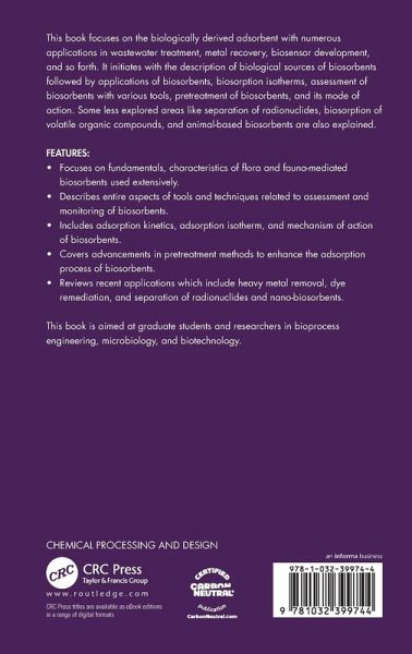 Features: Focuses on fundamentals, characteristics of flora and fauna-mediated biosorbents used extensivelyDescribes entire aspects of tools and techniques related to assessment and monitoring of biosorbentsIncludes adsorption kinetics, adsorption isotherm, and mechanism of action of biosorbentsCovers advancements in pretreatment methods to enhance the adsorption process of biosorbentsReviews recent applications which include heavy metal removal, dye remediation, and separation of radionuclides and nano-biosorbents This book is aimed at graduate students and researchers in bioprocess engineering, microbiology, and biotechnology.