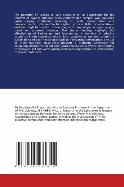 The potential of Bacillus sp. and Fusarium sp. as biosorbents for the removal of copper and iron from contaminated samples was evaluated under varying conditions, including pH, metal concentration, and temperature, to optimize the biosorption process. Both microbial strains exhibited high biosorption efficiencies, with removal percentages varying based on exposure duration. The study's findings highlight the effectiveness of Bacillus sp. and Fusarium sp. in significantly reducing copper and iron concentrations in both wastewater and soil, offering a sustainable and eco-friendly approach to heavy metal remediation. The use of these microbial biosorbents presents a promising alternative for mitigating environmental pollution caused by industrial waste, contributing to improved soil and water quality while reducing reliance on conventional chemical treatments.