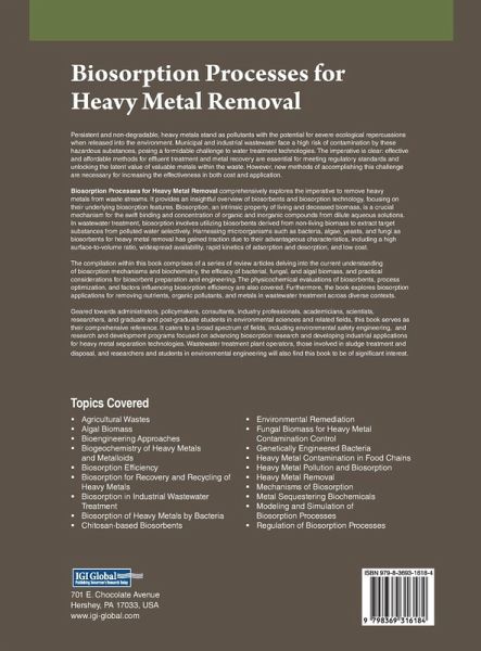 Persistent and non-degradable, heavy metals stand as pollutants with the potential for severe ecological repercussions when released into the environment. Municipal and industrial wastewater face a high risk of contamination by these hazardous substances, posing a formidable challenge to water treatment technologies. The imperative is clear: effective and affordable methods for effluent treatment and metal recovery are essential for meeting regulatory standards and unlocking the latent value of valuable metals within the waste. However, new methods of accomplishing this challenge are necessary for increasing the effectiveness in both cost and application Biosorption Processes for Heavy Metal Removal comprehensively explores the imperative to remove heavy metals from waste streams. It provides an insightful overview of biosorbents and biosorption technology, focusing on their underlying biosorption features. The compilation within this book comprises of a series of review articles delving into the current understanding of biosorption mechanisms and biochemistry, the efficacy of bacterial, fungal, and algal biomass, and practical considerations for biosorbent preparation and engineering. The physicochemical evaluations of biosorbents, process optimization, and factors influencing biosorption efficiency are also covered. Furthermore, the book explores biosorption applications for removing nutrients, organic pollutants, and metals in wastewater treatment across diverse contexts. Geared towards administrators, policymakers, consultants, industry professionals, academicians, scientists, researchers, and graduate and post-graduate students in environmental sciences and related fields, this book serves as their comprehensive reference.