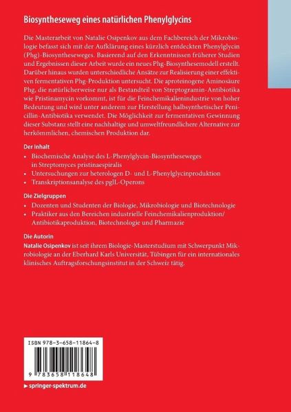 über hinaus wurden unterschiedliche Ansätze zur Realisierung einer effektiven fermentativen Phg-Produktion untersucht. Die aproteinogene Aminosäure Phg, die natürlicherweise nur als Bestandteil von Streptogramin-Antibiotika wie Pristinamycin vorkommt, ist für die Feinchemikalienindustrie von hoher Bedeutung und wird unter anderem zur Herstellung halbsynthetischer Penicillin-Antibiotika verwendet. Die Möglichkeit zur fermentativen Gewinnung dieser Substanz stellt eine nachhaltige und umweltfreundlichere Alternative zur herkömmlichen, chemischen Produktion dar.