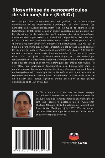 Les nanoparticules représentent un défi général pour la technologie d'aujourd'hui et les observations scientifiques du futur proche. Les nanoparticules couvrent pratiquement tous les types de sciences et de technologies de fabrication et ont un impact considérable sur presque tous les domaines de la recherche, qu'il s'agisse d'activités scientifiques fondamentales ou plus axées sur la résolution de problèmes. Dans ce sens, le livre fournit une vue d'ensemble de la recherche de pointe sur la "Synthèse de nanocomposites biogènes de silicium/silice (Si/SiO2) par le biais de divers micro-organismes". L'objectif de cet ouvrage est de combler les lacunes en matière d'informations complètes afin d'aider à la fois les nouveaux venus et les experts dans un domaine de recherche en plein essor. De nos jours, la bio-nanotechnologie est une technologie fonctionnelle clé. Il s'agit d'une fusion de la biologie et de la nanotechnologie basée sur les principes et les voies chimiques des organismes vivants, et se réfère aux applications fonctionnelles des biomolécules dans la nanotechnologie. La biodégradabilité des fibres végétales peut contribuer à un écosystème sain, tandis que leur faible coût et leur haute performance répondent aux intérêts économiques de l'industrie. La balle de riz et le son de blé sont des résidus agricoles choisis en raison de leur grande disponibilité et de leur prix réduit.