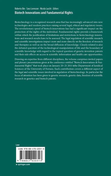 Drawing on expertise from differentdisciplines, the volume comprises invited papers and plenary presentations given at the conference entitled "Biotech Innovations & Fundamental Rights" that took place on Januray 20-21 2011 at the Department of Juridical Sciences of the University of Ferrara. Each contribution covers a different aspect of the legal and scientific issues involved in regulation of biotechnology. In particular the focus of attention has been given to genetic research, genetic data, freedom of scientific research in genetics and biotech patents.