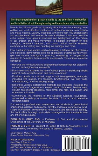 The first comprehensive, practical guide to the selection, construction, and installation of soil bioengineering and biotechnical slope protection Here is the ultimate guide to physically attractive, environmentally compatible, and cost-effective methods of protecting slopes from erosion and mass wasting. Lavishly illustrated with more than 150 photographs and supplemented with scores of charts and tables, this book covers the entire subject from general principles and background on the nature of soil erosion and mass movement to detailed information on root strengths, treatment selection, unit costs, critical tractive stresses, methods for harvesting and handling live cuttings, and more. Four illustrated case studies, each addressing a different set of problems and solutions, demonstrate both the application of particular technologies and the site investigation, planning, scheduling, and organization required to complete these projects successfully. This unique reference handbook * Reviews the horticultural and engineering underpinnings for biotechnical and soil engineering treatments * Documents and explains the role of woody plants in stabilizing slopes against both surficial erosion and mass movement * Provides details on a broad range of soil bioengineering methods, including live staking, live fascines, brushlayering, live crib walls, branchpacking, and live slope gratings * Describes various biotechnical methods and materials, including the incorporation of vegetation in erosion control blankets, flexible mats, cellular revetments (geocells), rock armor (rip rap), and gabion and open-front crib walls * Summarizes the findings of the National Science Foundation-sponsored workshop to assess the state of the art and determine research needs For practicing professionals, researchers, and students in geotechnical engineering, geology, soil science, forestry and forest engineering, landscape architecture, environmental horticulture, and restoration ecology, this book offers thorough, up-to-date coverage that is not available from any other single source.