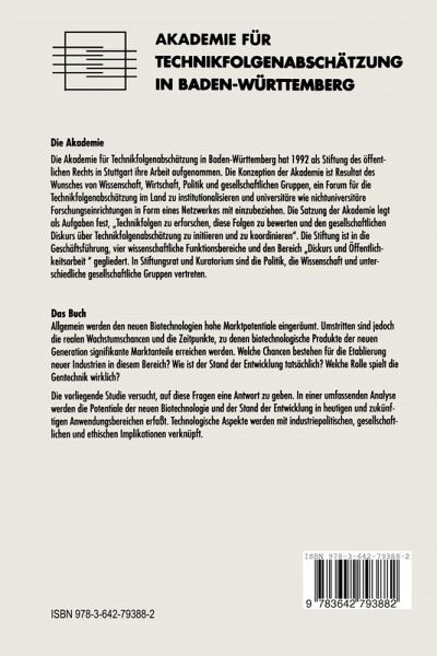 1 Einführung.- 2 Pilotstudie und Stellungnahmen.- 2.1 Pilotstudie.- 2.2 Stellungnahme des Umweltministeriums Baden Württemberg.- 2.3 Stellungnahme des Landesnaturschutzbundes Baden-Württemberg.- 2.4 Biotechnologie als Gegenstand von Technikfolgenabschätzung.- 3 Gutachten.- 3.1 Neuartige Ansätze der Biotechnologie bei der Entwicklung von Arzneimitteln und Impfstoffen.- 3.2 Neue biotechnologische Ansätze in der Enzymtechnologie, Enzymproduktion und in der Diagnostik.- 3.3 Neue biotechnologische Ansätze in der Krebstherapie.- 3.4 Zum Stand der molekularbiologischen Forschung in der medizinischen Virologie.- 3.5 Neue biotechnologische Ansätze in der Lebensmittel-produktion und -verarbeitung.- 3.6 Wirkungen des Einsatzes der neuen Biotechnologie in der Lebensmittelproduktion.- 3.7 Stand und Nutzungsperspektiven der molekularen Pflanzengenetik.- 3.8 Biotechnologische Ansätze für die Züchtung gesunder Pflanzen und ihre Bedeutung für die Entwicklung umweltschonender Anbauverfahren.- 3.9 Beiträge der Biotechnologie zur Verbesserung von Qualitäts- und Leistungseigenschaften landwirtschaftlicher Kulturpflanzen.- 3.10 Erfahrungen mit dem Einsatz der Bio- und Gentechnologie in einem praktischen Pflanzenzuchtbetrieb.- 3.11 Das Potential von Biotechnologie und Gentechnik in der Forstpflanzenzüchtung.- 3.12 Biotechnologie als Grundlage neuer Verfahren in der Tierzucht.- 3.13 Neue Verfahren der mikrobiellen Abwasserbehandlung und der Reststoffverwertung.- 3.14 Perspektiven der Umweltbioverfahrenstechnik.- 3.15 Stand der Technik und Perspektiven bei Biosensoren - Die Integration der Biosensoren in die Spurenanalytik.- 3.16 Gentechnik als Grundlage neuer Industrien unter den rechtlichen Rahmenbedingungen der EG und Deutschlands.- 3.17 Die Bedeutung rechtlicherRahmenbedingungen für die Anwendung der Gentechnik in der Bundesrepublik Deutschland.- 3.18 Erfahrungen aus der Arbeit der Zentralen Kommission für Biologische Sicherheit.- 3.19 Zur Bedeutung der Biotechnologischen Industrie in Deutschland und in der EG.- 3.20 Nachholende Modernisierung und internationales Innovationsmanagement - Strategien der deutschen Chemie- und Pharmakonzerne.- 3.21 Arbeits- und industriepolitische Entwicklungsperspektiven der Biotechnologie.- 3.22 Qualifikationsentwicklung in der pharmazeutisch-chemischen Industrie - Aktuelle Tendenzen und ihre Bedeutung für die neue Biotechnologie.- 3.23 Ethische Evaluierung der Biotechnologie.- 3.24 Probleme der Entscheidung über Sozialverträglichkeit.- 3.25 Die Chancen und Risiken der Gentechnologie aus der Sicht der Bevölkerung.- 4 Baden-württembergische Unternehmensstrukturen und Potentiale in der Biotechnologie (Zusammenfassung).- 5 Workshop und Diskussion.- 5.1 Der Bereich Pharma und Medizin.- 5.2 Biotechnologische Verfahren in der Pflanzenzüchtung.- 5.3 Biotechnologie in der Tierzucht und Nutztierhaltung.- 5.4 Lebensmitteltechnologie.- 5.5 Umwelt/Bioverfahrenstechnik und Biosensoren.- 5.6 Rechtliche Rahmenbedingungen.- 5.7 Industriepolititk.- 5.8 Qualifikation und Arbeitsplätze.- 5.9 Fragen der Umsetzung und der Förderpolitik.- 5.10 Literatur.- 6 Synopse.