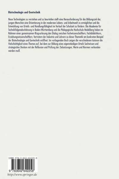 Technikfolgenabschätzung - Aufgaben und Perspektiven.- Das BioRegio-Konzept des Rhein-Neckar-Dreiecks: Vision und Strategie.- Biotechnologie und Gentechnik - Implikationen für das Bildungswesen.- Ethik der Tugend und Soziobiologie - eine realistische Perspektive? Entwicklung moralischer Urteils- und Handlungsfähigkeit im Bereich neuer Technologien.- Die Rolle der Wissenschaftsethik im Ethikunterricht.- Verantwortung als Zielsetzung und Gegenstand des Ethikunterrichtes.- Biotechnologie im Unterricht.- Alltagsmythen und Metaphern - Phantasien von Jugendlichen zur Gentechnik.- Gentechnik aus der Sicht von Schülern.- Gentechnik und ethische Urteilsbildung - ein Beispiel aus der Landwirtschaft.- 'Wenn die Antimatsch-Tomate als Tomatenpüree endet...' - Überlegungen zur ethischen Urteilsbildung am Beispiel der sogenannten Flavr-Savr-Tomate.- Gentechnik und Öffentlichkeit.