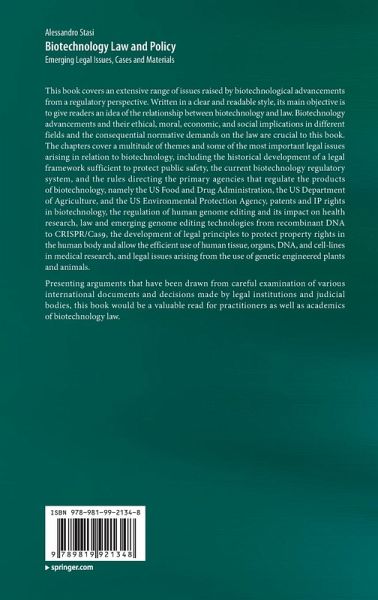 This book covers an extensive range of issues raised by biotechnological advancements from a regulatory perspective. Written in a clear and readable style, its main objective is to give readers an idea of the relationship between biotechnology and law. Biotechnology advancements and their ethical, moral, economic, and social implications in different fields and the consequential normative demands on the law are crucial to this book. The chapters cover a multitude of themes and some of the most important legal issues arising in relation to biotechnology, including the historical development of a legal framework sufficient to protect public safety, the current biotechnology regulatory system, and the rules directing the primary agencies that regulate the products of biotechnology, namely the US Food and Drug Administration, the US Department of Agriculture, and the US Environmental Protection Agency, patents and IP rights in biotechnology, the regulation of human genome editingand its impact on health research, law and emerging genome editing technologies from recombinant DNA to CRISPR/Cas9, the development of legal principles to protect property rights in the human body and allow the efficient use of human tissue, organs, DNA, and cell-lines in medical research, and legal issues arising from the use of genetic engineered plants and animals.
