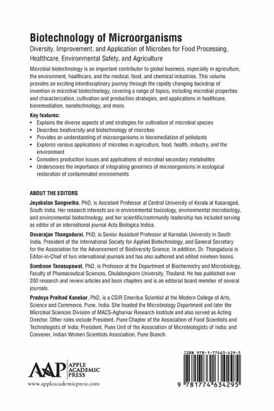 Jeyabalan Sangeetha, PhD, is Assistant Professor at Central University of Kerala at Kasaragod, South India. Her research interests are in environmental toxicology, environmental microbiology, and environmental biotechnology, and her scientific/community leadership has included serving as editor of an international journal Acta Biologica Indica. Devarajan Thangadurai, PhD, is Senior Assistant Professor at Karnatak University in South India, President of the International Society for Applied Biotechnology, and General Secretary for the Association for the Advancement of Biodiversity Science. In addition, Dr. Thangadurai is Editor-in-Chief of two international journals and has also authored and edited nineteen books. Somboon Tanasupawat, PhD, is Professor at the Department of Biochemistry and Microbiology, Faculty of Phamaceutical Sciences, Chulalongkorn University, Thailand. He has published over 200 research and review articles and book chapters and is an editorial board member of several journals. Pradnya Pralhad Kanekar, PhD, is a CSIR Emeritus Scientist at the Modern College of Arts, Science and Commerce, Pune, India. She headed the Microbiology Department and later the Microbial Sciences Division of MACS-Agharkar Research Institute and also served as Acting Director. Other roles include President, Pune Chapter of the Association of Food Scientists and Technologists of India; President, Pune Unit of the Association of Microbiologists of India; and Convener, Indian Women Scientists Association, Pune Branch.