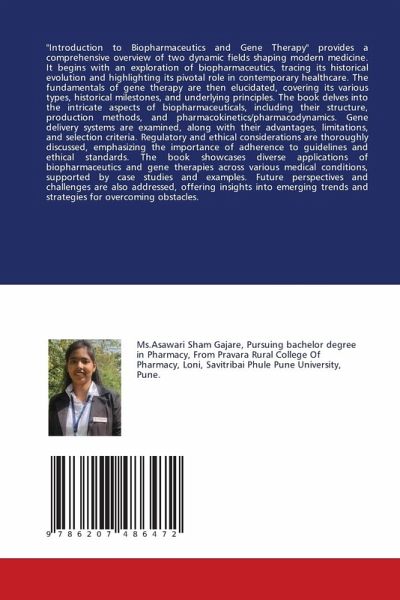 "Introduction to Biopharmaceutics and Gene Therapy" provides a comprehensive overview of two dynamic fields shaping modern medicine. It begins with an exploration of biopharmaceutics, tracing its historical evolution and highlighting its pivotal role in contemporary healthcare. The fundamentals of gene therapy are then elucidated, covering its various types, historical milestones, and underlying principles. The book delves into the intricate aspects of biopharmaceuticals, including their structure, production methods, and pharmacokinetics/pharmacodynamics. Gene delivery systems are examined, along with their advantages, limitations, and selection criteria. Regulatory and ethical considerations are thoroughly discussed, emphasizing the importance of adherence to guidelines and ethical standards. The book showcases diverse applications of biopharmaceutics and gene therapies across various medical conditions, supported by case studies and examples. Future perspectives and challengesare also addressed, offering insights into emerging trends and strategies for overcoming obstacles.