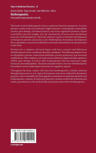 This book reviews biotherapeutics from a medicinal chemistry perspective. It covers proteins, nucleic acids, low molecular weight hormones, small peptides, extracellular vesicles, gene therapy, cell-based products, and tissue-engineered products. Expert contributors provide insights into the mechanisms of action and translational processes of biotherapeutics. Particular attention is given to the latest developments in therapeutic proteins and nucleic acids. Biotherapeutic formulation developments like encapsulation, structural modifications and nanovehiculization are also presented in this book.