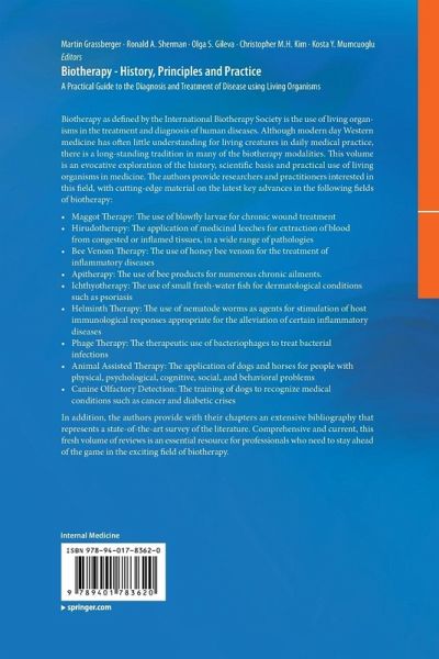 Biotherapy is defined as the use of living organisms in the treatment and diagnosis of human and animal diseases. This volume is an evocative exploration of the history, scientific basis and practical use of the major biotherapy modalities. The authors provide researchers and practitioners interested in this field, with cutting-edge material on the latest key advances in the following fields of biotherapy: Maggot Therapy, Hirudotherapy, Bee Venom Therapy, Apitherapy, Ichthyotherapy, Helminth Therapy, Phage Therapy, Animal Assisted Therapy, Canine Olfactory Detection. In addition, the authors provide with their chapters an extensive bibliography that represents a state-of-the-art survey of the literature. Comprehensive and current, this fresh volume of reviews is an essential resource for professionals who need to stay ahead of the game in the exciting field of biotherapy.