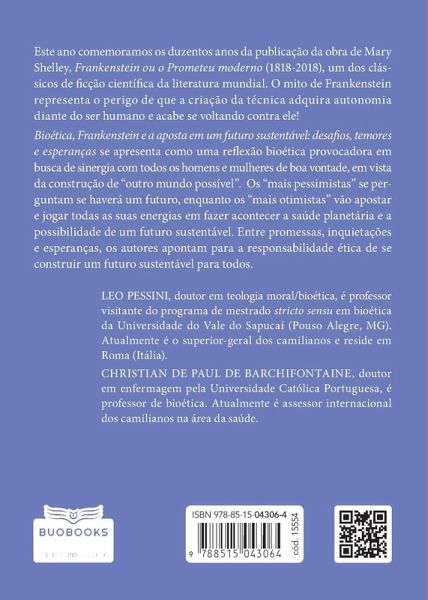 Em 2018 comemoramos os duzentos anos da publicação da obra de Mary Shelley, Frankenstein ou o Prometeu moderno (1818-2018), um dos clássicos de ficção científica da literatura mundial. O mito de Frankenstein representa o perigo de que a criação da técnica adquira autonomia diante do ser humano e acabe se voltando contra ele! Bioética, Frankenstein e a aposta em um futuro sustentável: desafios, temores e esperanças se apresenta como uma reflexão bioética provocadora em busca de sinergia com todos os homens e mulheres de boa vontade, em vista da construção de ¿outro mundo possível¿. Os ¿mais pessimistas¿ se perguntam se haverá um futuro, enquanto os ¿mais otimistas¿ vão apostar e jogar todas as suas energias em fazer acontecer a saúde planetária e a possibilidade de um futuro sustentável. Entre promessas, inquietações e esperanças, os autores apontam para a responsabilidade ética de se construir um futuro sustentável para todos.